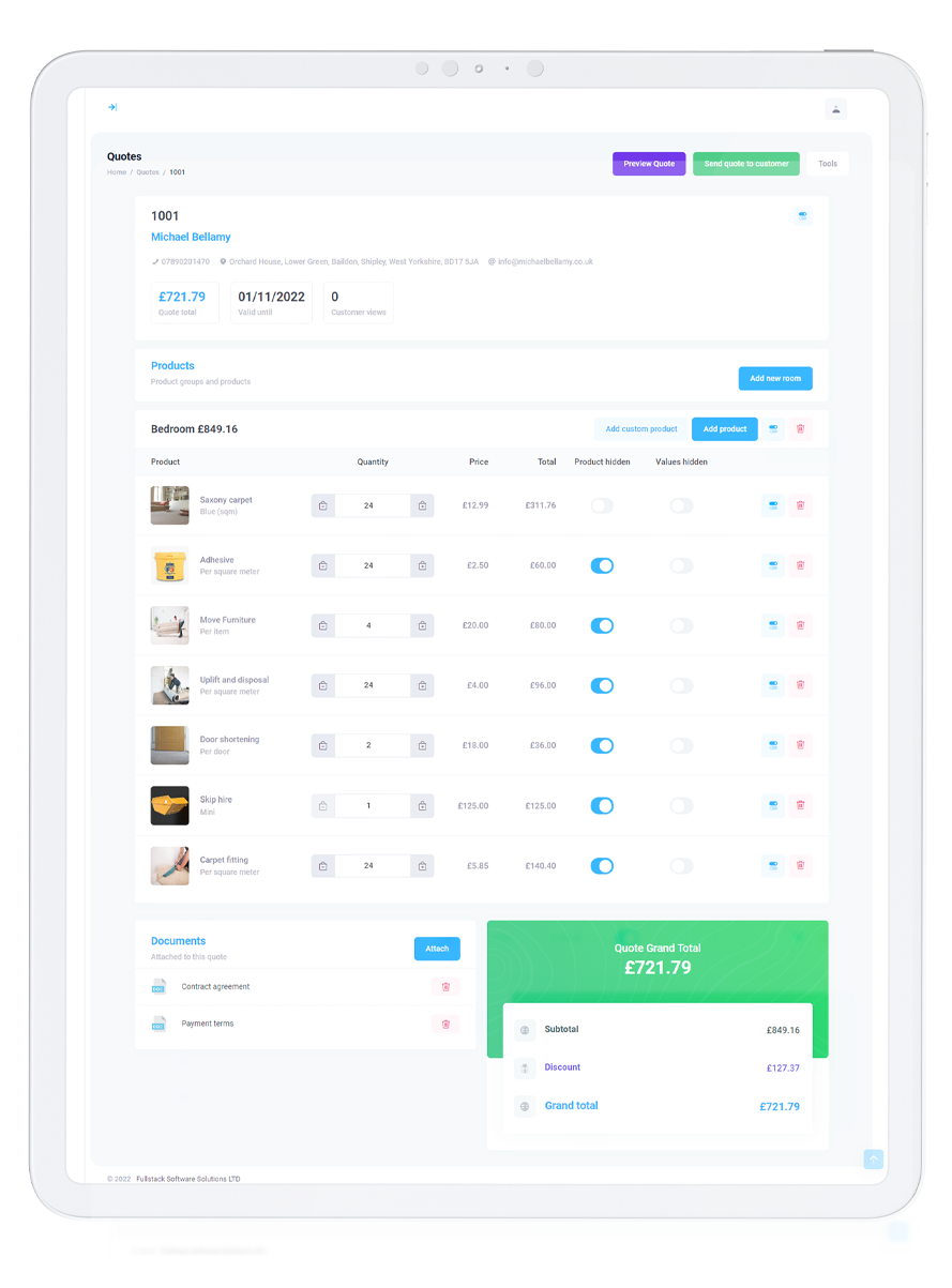 Products and pricing can be overridden per quote, so you're in control. Discounts can also be added